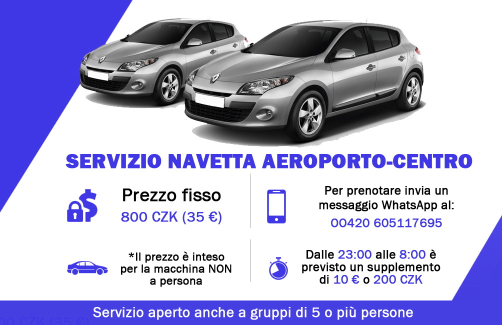 Consigliamo a chiunque volesse prendere il taxi dall’aeroporto per raggiungere il centro di rivolgersi al nostro caro amico tassista Marco: professionale, italianissimo, giovane, simpatico, educato, onesto. Marco per ciascuna corsa da aeroporto a centro città chiede 35 Euro fisse o 800 corone ceche (a macchina e non a persona). Per accordarsi con Marco occorre prendere appuntamento tramite WhatsApp con qualche giorno di anticipo, vi lasciamo il suo contatto.